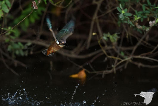 昨日、ピラカンサの枝やトベラの枝に10回くらい止まったというので、今日は「ピラカワ」を期待して16時前に池に到着・・・しかしもう2時間も前からオスとメスが追いかけっこをしているとのこと・・・結局16時半過ぎても追いかけっこは続き、採餌もせずに飛び回っているという、ちょっと不可解な状況でした。いずれはお腹をすかして駐車場下の池に飛来すると思って移動して待つこと数分、メスが飛来してきました、が、石には止まらず通過して奥の土手へ、まだトビモノが撮れる明るさなので、感度をISO6400まで上げた瞬間に飛び込んでお魚ゲット・・・そのまま石に戻って来た! 咄嗟に反応して石への飛びつきにシャッタを切ってそのまま数コマ連写・・・ゲゲゲ、ISO64からISO6400に変えた後、SSを1/30秒から変更するのを忘れていた=超露出オーバーで真っ白!(^o^) すぐに魚を呑み込んでしまったので、とりあえず感度を下げて数コマ連写・・・その後ライブビューに切り替えて(数秒待つ)、適正露出のISO64、SS1/10秒に設定して、レリースを手にしたら飛ばれてしまいました。ピラカンサの池へオスの様子を見に行ったのでしょう。そのままSS1秒での撮影を期待して待っていると、17時15分に再度飛来・・・SS1秒で待ちましたが、残念ながら石には止ってくれませんでした。