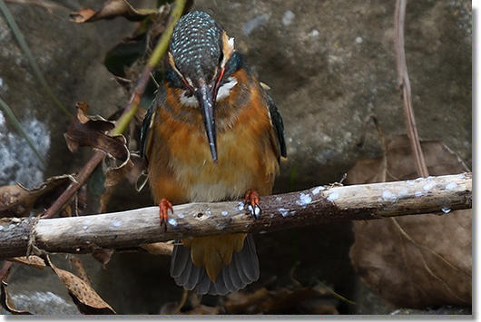 結局今日も出会いは期待薄ですが、日課の散歩に出かけました。オスはやっぱり飛来せず、期待の「新人」・・・いや、「新鳥」が挨拶に来てくれました。昨日撮影したオスの雛とは違い、幼鳥です。東側の枝に飛来、その後欄干へ移動して、真下に飛び込んでヤゴのような水棲昆虫を2度捕食しました後、ピラカンサの横枝へ・・・10分くらい待たされて飛び込まれた場所が欄干の陰・・・採餌に失敗してそのまま川の方へ消えてしまいましたが、オスが来なくなったので、幼鳥が数羽、飛来してくれるようになると、少しは楽しめるかも。