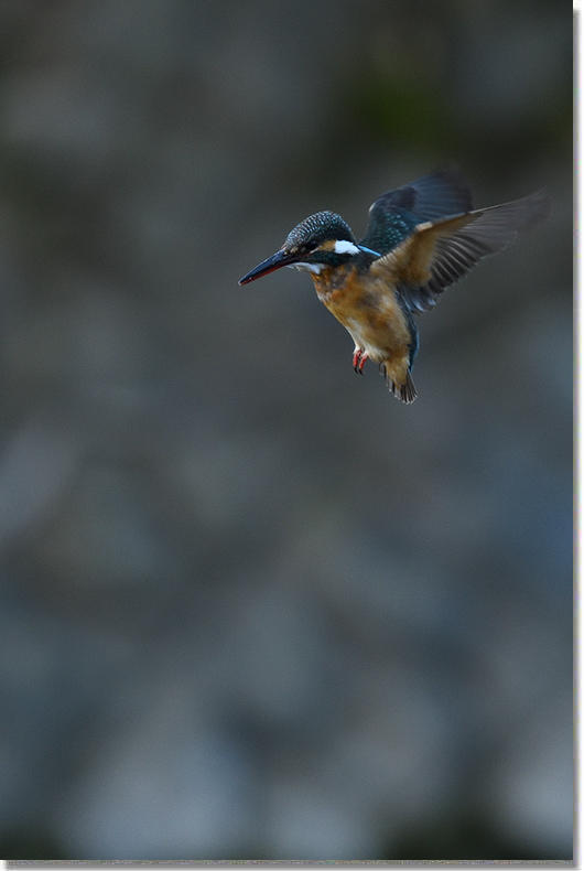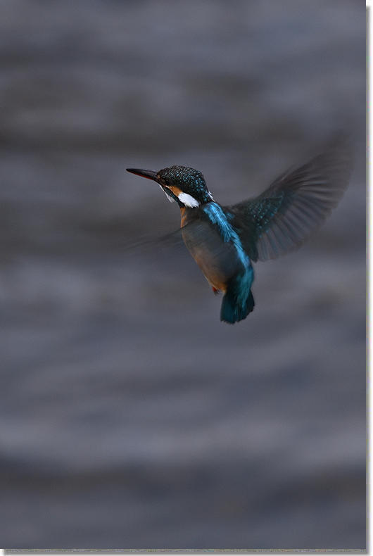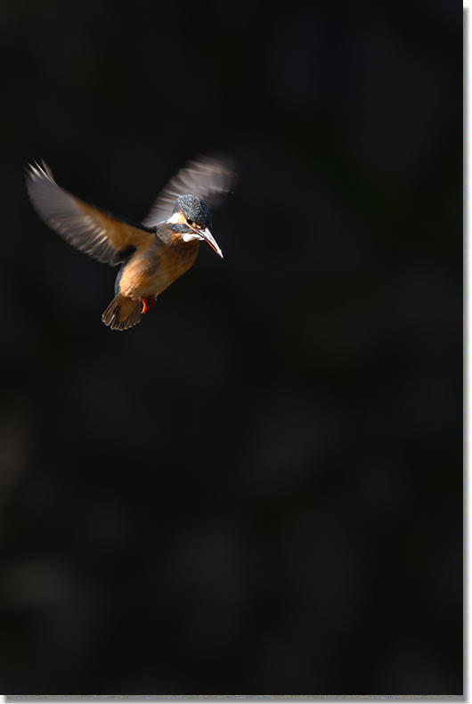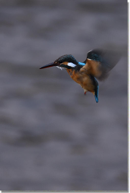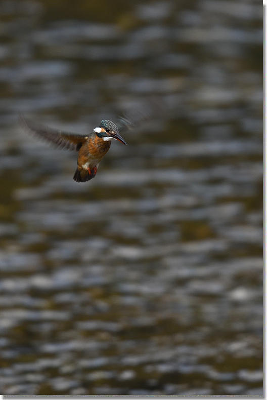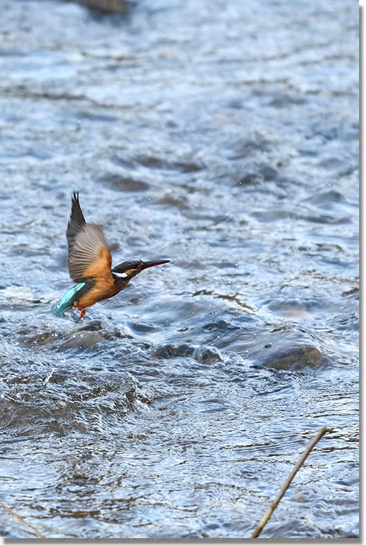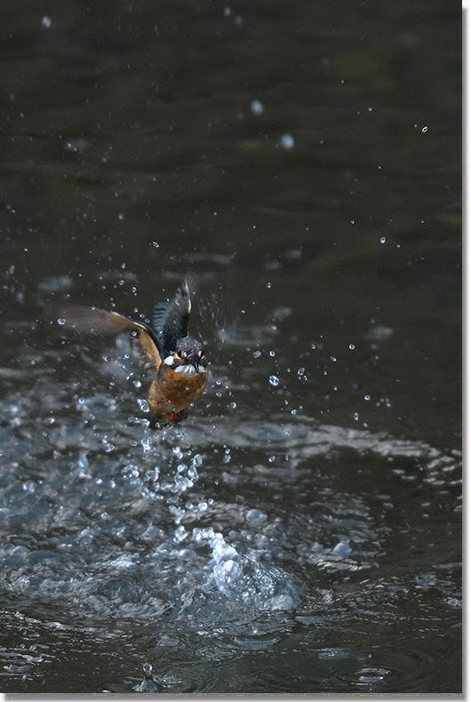 ピラカンサの枝からは3度飛び込みましたが、順光側からだったので、2度は背景が欄干になるはるか遠くへ・・・手前側に戻ってくるので、小さなカワセミにAFはほぼ無反応、空しくジャスピンの水飛沫だけが残ったまま・・・幸いにもこの時は一旦真上へ飛び出したので1コマだけピントが合いましたが、次のカットからはピンぼけ・・・