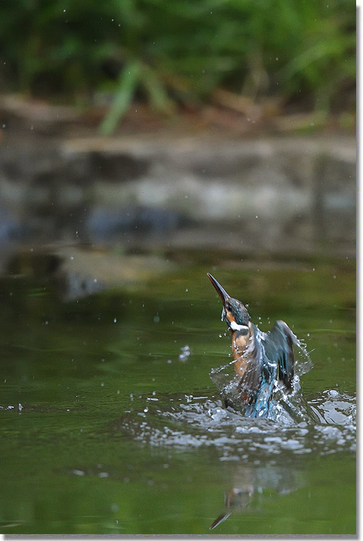 猛暑だから行かない、と言いながら、行ってしまう・・・やっぱりカワセミ病はたちが悪い病ですね。(^o^) 流石に暑かったので出撃は5時前、ま、ワンチャンスあればいいという思いでした。状況は相変わらずで、夕食時間帯にメスが縄張りに侵入してくる幼鳥を気にして、延々と目立つ場所、トベラの枝でまったり・・・無風で蒸し暑い、蚊などの虫が群がる、いつ飛び込むか分からないままただ待つって、もはや苦痛以外の何ものでもないです。当然集中力が維持できず、17時48分、「あ、飛び出した!」と思った瞬間には手遅れ・・・想定より遠くへ飛び込まれたこともありますが、水出の瞬間には全く間に合わずピンぼけ連発・・・折角大物ゲット、しかも魚の尾をかろうじて捕まえただけだったので、暴れる魚を必死でこらえながら枝に戻る様は、まさにドラマだったのに・・・戻る間の4コマしか残せなかったとは・・・あ~あ、痛恨の極みです。ま、あの過酷な状況下で、飛び込むまで30以上も待たされて、4コマ残せたんだからラッキーだったのかも、急に蚊に刺されたところが痒くなってきました。(^o^) メスは勿論、夕食は終わり、満腹でしばらく動けない状態だったので、早速幼鳥が飛来して少し遊んでくれました。でも暗い・・・欄干からの飛び込みでも、幼鳥には難しく、飛び込んでもほとんど成果なしでしたね。