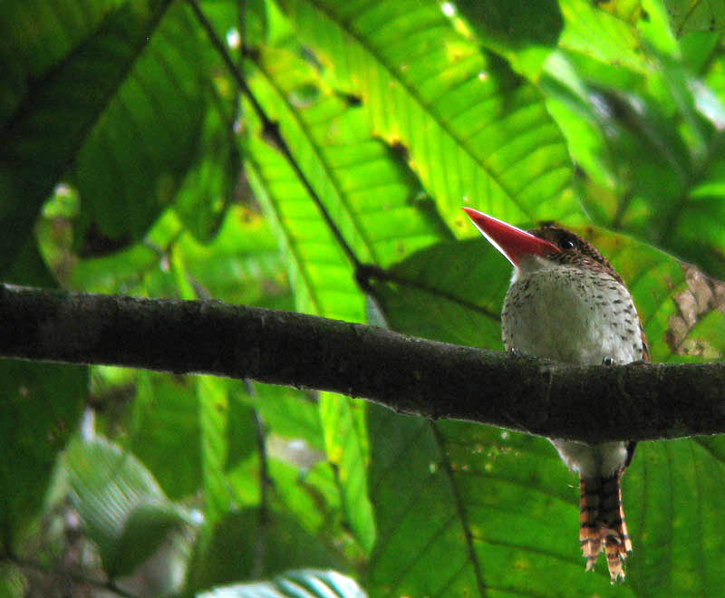 カワセミ病のeisvogelさんには、申し訳ないのですが、実はカワリサンコウチョウです。サンコウチョウのアジア版の白です。これは雨季の五月と六月しか見れません。私はラケットカワセミを見てしまったから、どうしても長い吹流しの尾羽に魅了されてしまいます。今回は、自分の機材に泣かされました。もう少しバージョンアップしないと、暗くて・・・。今の私の機材では、これぐらいで精一杯でした。。。 |